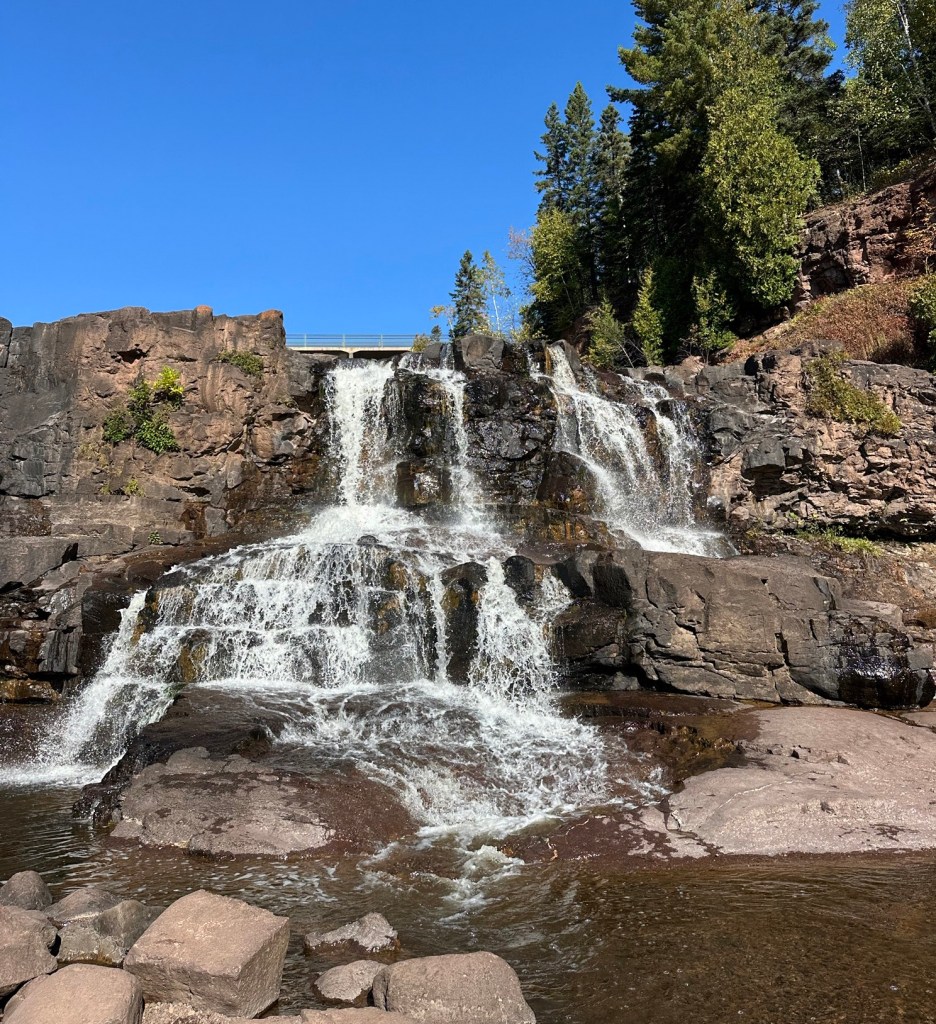 After exploring the lakeside, we got on our bikes and rode 1.7 miles to Tettegouche State Park. The beauty of this park was astounding. First, we hiked to the High Falls. The trail was relatively easy and marked well. At the end, the trail leads to a large waterfall which was much prettier than I expected. I walked through the chilly water and sat on a log near the waterfall for a serene view. During our visit, we enjoyed relatively little crowds and nice weather making the stop more enjoyable. After enjoying the waterfall my skin had turned pink from how cold the water was. Worth it!