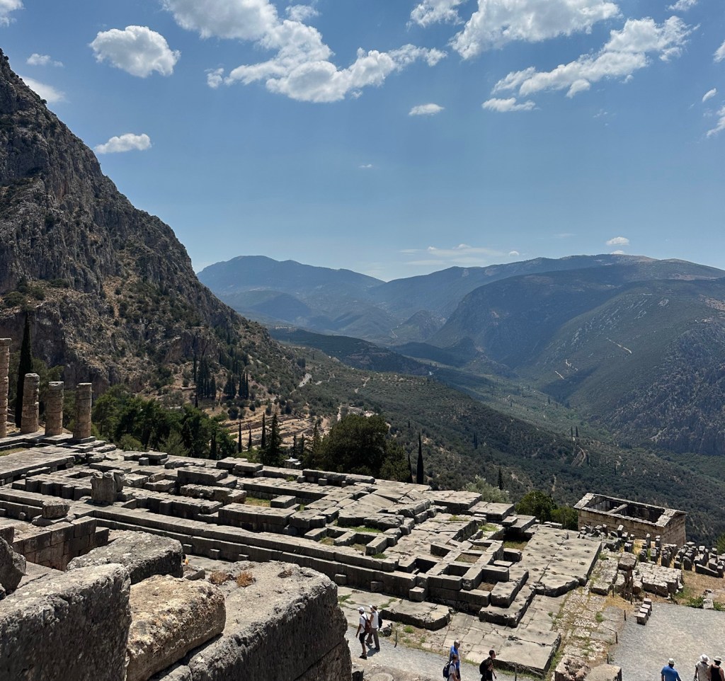 Our last day in Greece was chaos of the best kind. We left the hotel early and started driving across the southern part of the country. We sat on the bus for a long time and most of of us slept, but while we were awake we enjoyed beautiful views of the mountainous countryside. We passed many small villages, and all kinds of beautiful beaches. Finally we arrived at Delphi. This is a major historical destination in Greece where you can hike the mountainside to view ancient ruins. First we toured the Archaeological museum which was full of interesting artifacts. After learning about the historical sight we started our ascent. The views were spectacular all around us. We could see the ancient stadium and other ruins, with a wonderful scenic backdrop. This was my favorite thing we did in Greece. It was a great break from our bus ride and a excellent experience.