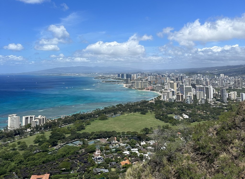 Diamond head is a fairly easy hike right by Waikiki beach. From the top of the mountain view the beautiful city of Honolulu which contrasts with the ocean and nature below.